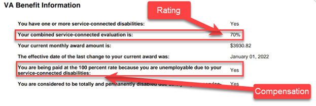 Eligibility for a 100% Service-Connected Disability is determined by the combined service-connected disability rating shown on the Veteran’s VA Benefits letter. It is not based on the compensation payment level.